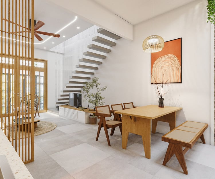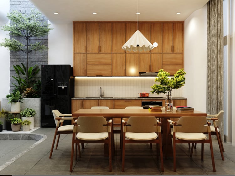 Thay vì trang trí thêm nhiều vật dụng cho nhà bếp, thì bạn chỉ cần lựa chọn bàn ăn có thiết kế hoặc gam màu nổi bật để tạo điểm nhấn cho phòng bếp nhà ống 5m là được. Sau đó, trang trí thêm một bức tranh đơn giản phía trên bàn ăn sẽ tăng thêm độ thẩm mỹ cho phòng bếp hơn.